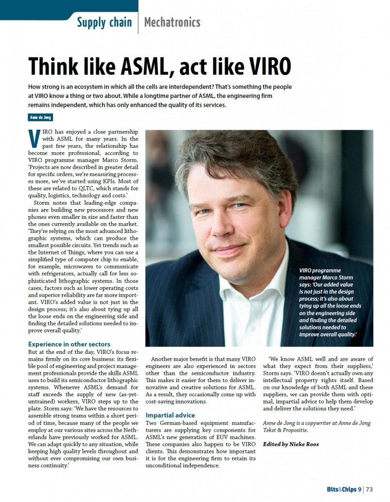 In Bits&Chips, VIRO talks about its long-standing collaboration with ASML and its desire to remain independent: Think like ASML, act like VIRO. ‘We can adapt quickly to any situation, while keeping high quality levels throughout and without ever compromising our own business continuity. Another major benefit is that many VIRO engineers are also experienced in sectors other than the semiconductor industry,’ says Programme Manager Marco Storm.