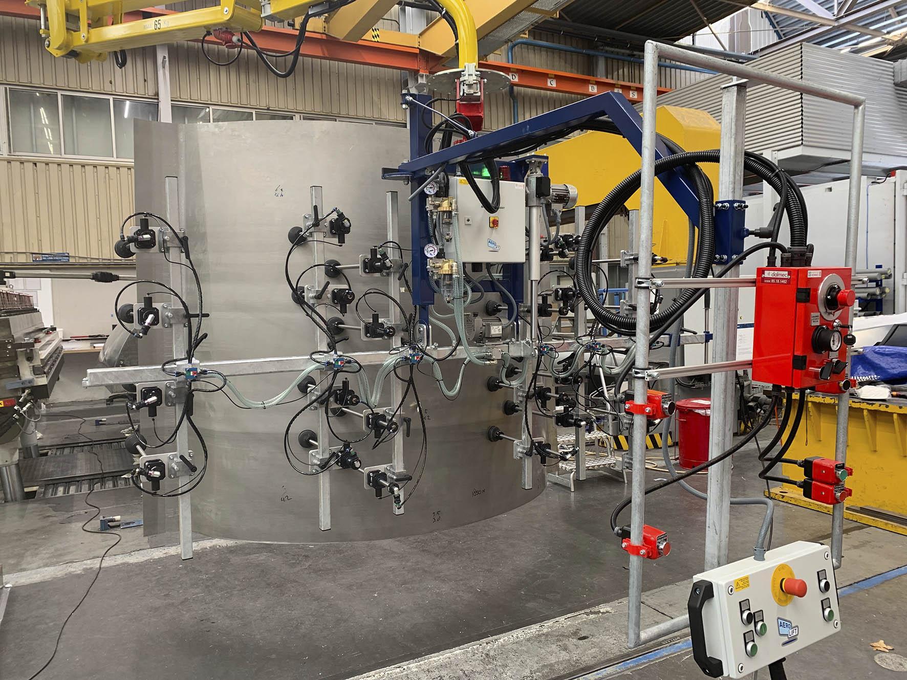 Voor het project van een klant worden meerdere extreem dunne aluminium sheets op elkaar gelamineerd. Deze sheets moeten bovendien gebogen zijn in een exact bepaalde radius. Het bedrijf vroeg drie partijen om een voorstel voor een sheet handler: een systeem dat de aluminium plaat op de vormbank legt en na de bewerking weer terugplaatst op een bokje. Dit gebeurde handmatig door vier medewerkers. De klant wilde dit terugbrengen naar maximaal twee medewerkers, die bovendien – om veiligheidsredenen – niet meer tussen de machinedelen hoeven te lopen.